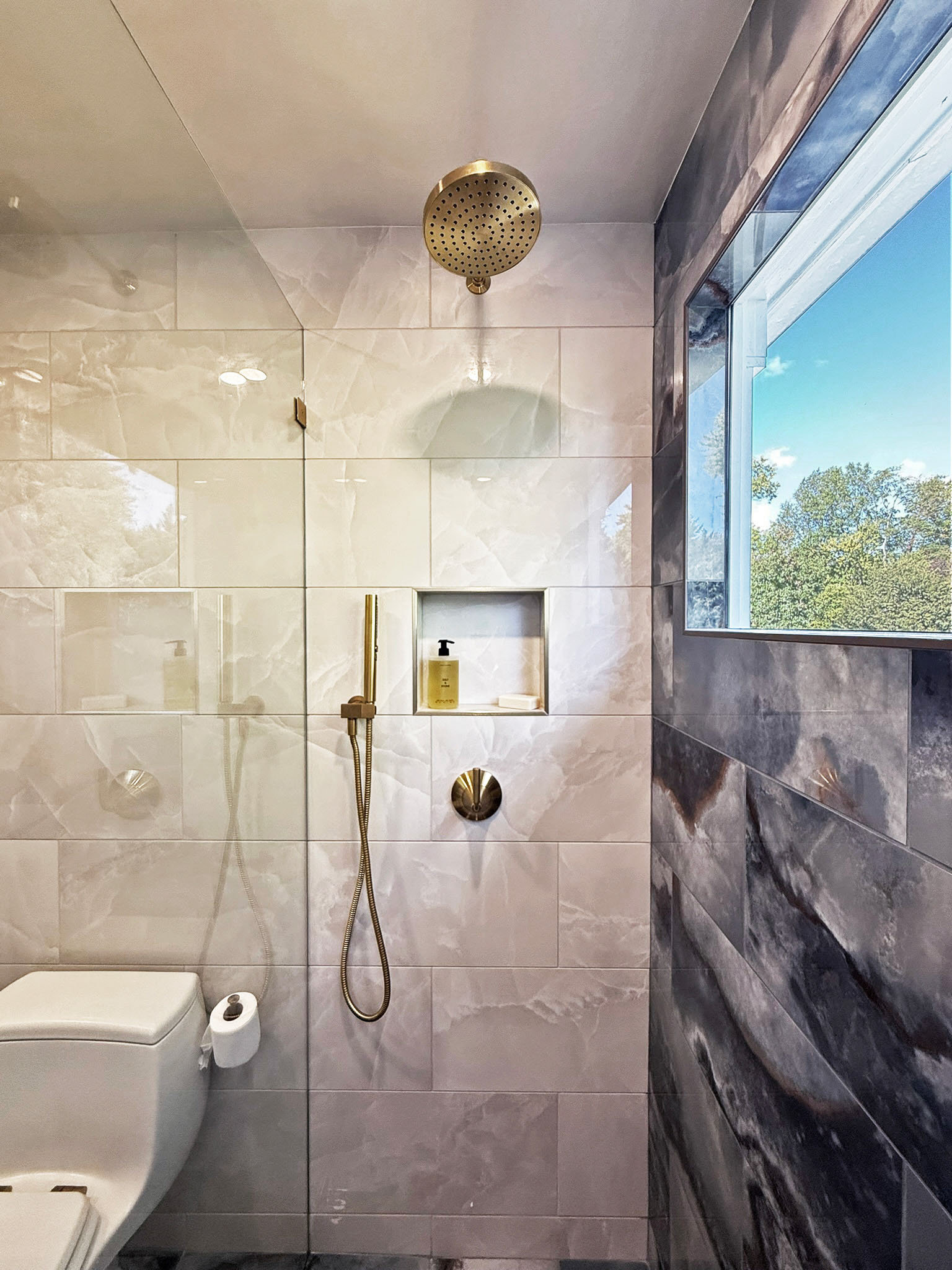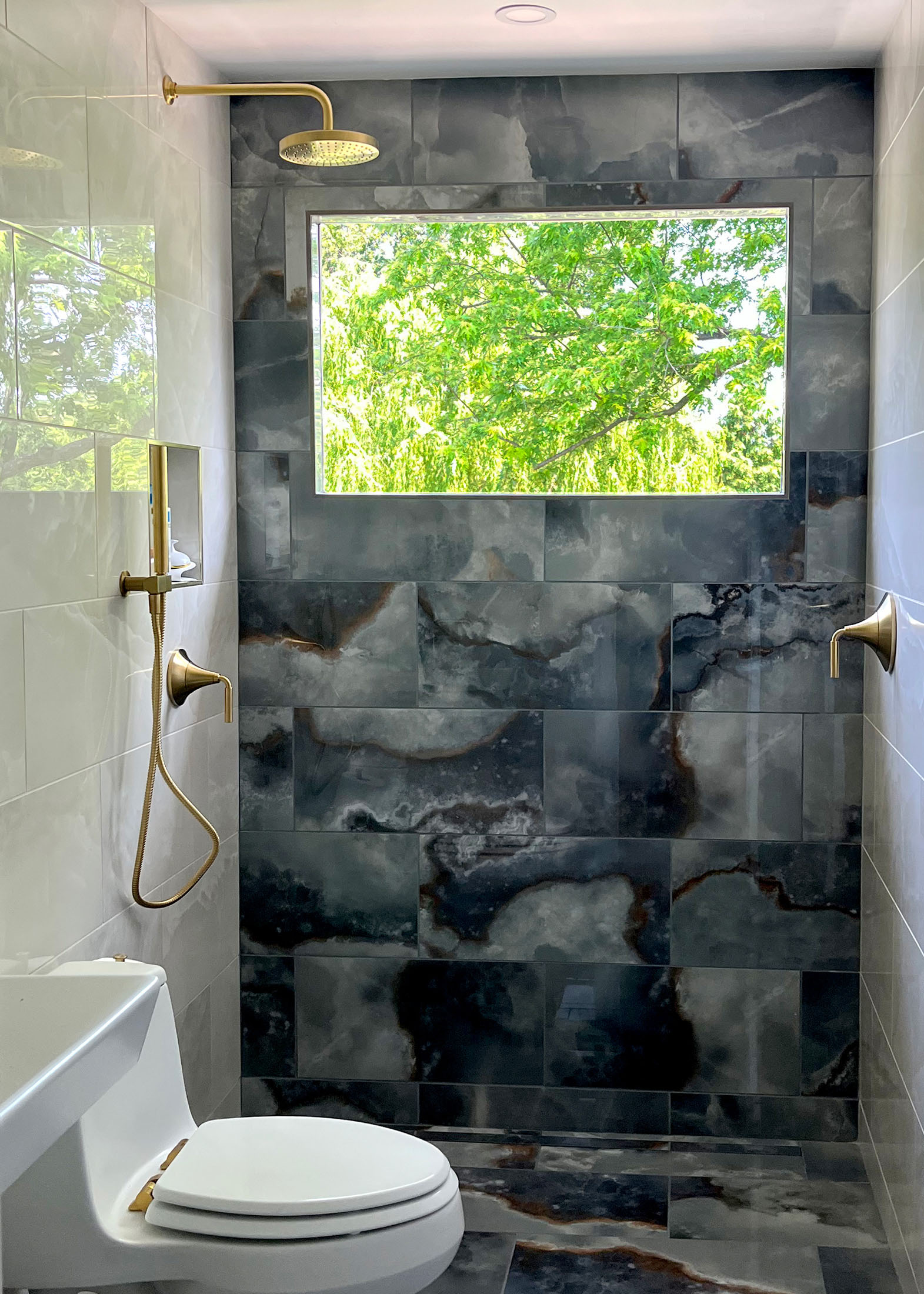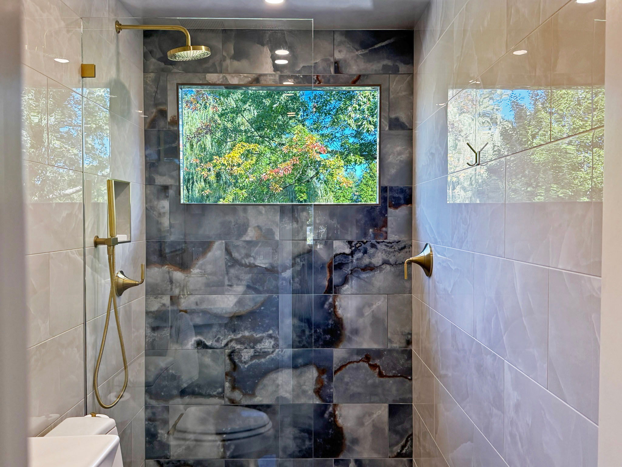 This total bathroom renovation started with beautiful contrasting tiles selected by the homeowner. The blue onyx tile is carried up from the floor to the back wall, highlighting a new, larger window in the shower. The window provides a beautiful view to the tree-lined yard that can be enjoyed all the way from the adjacent hall.