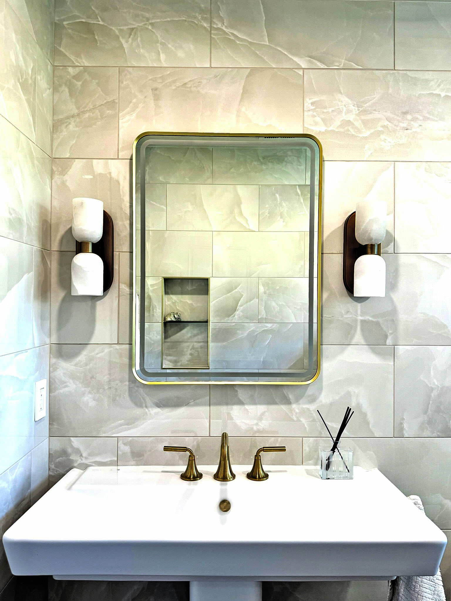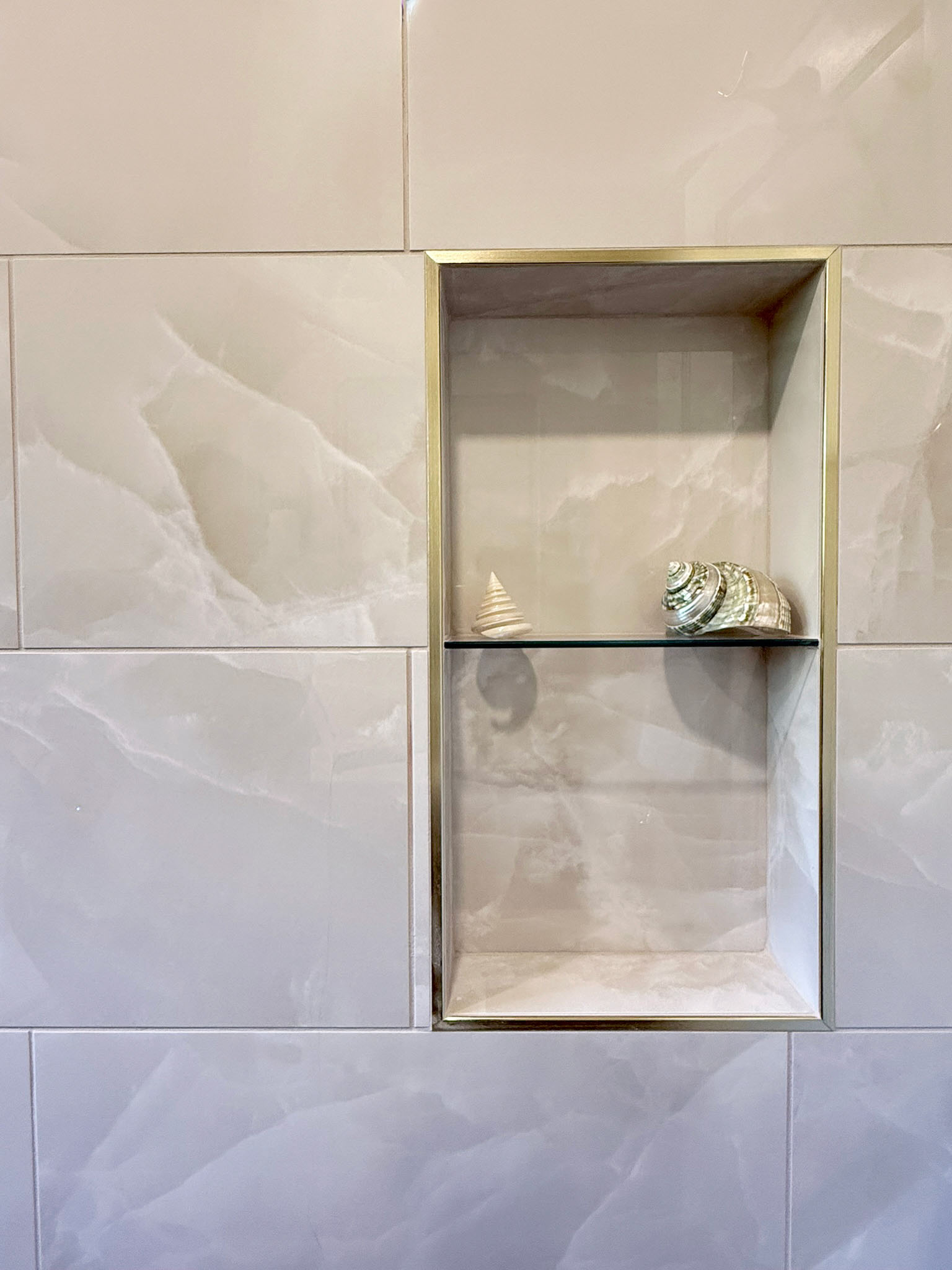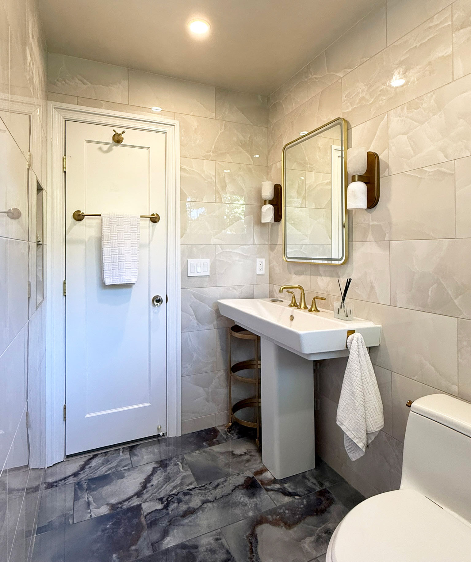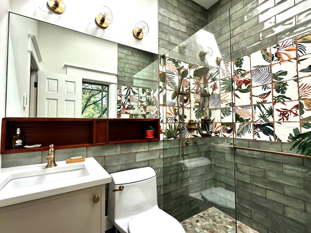 This total bathroom renovation started with beautiful contrasting tiles selected by the homeowner. The blue onyx tile is carried up from the floor to the back wall, highlighting a new, larger window in the shower. The window provides a beautiful view to the tree-lined yard that can be enjoyed all the way from the adjacent hall.